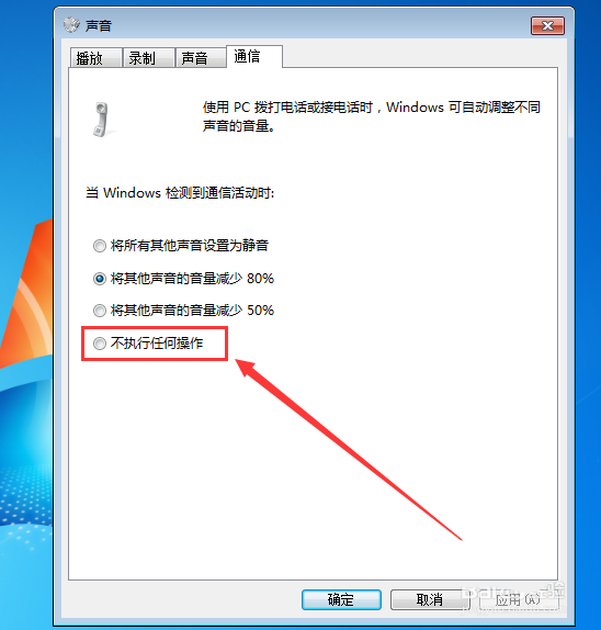 4、打開通信選項之后,我們在它底下的選項里選擇“不執行任何操作” 如圖