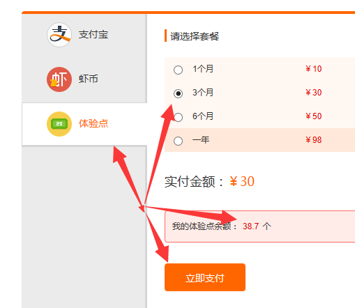 6、進(jìn)入支付頁面,選擇體驗(yàn)點(diǎn)支付。