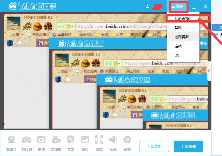8、我們點擊上方的“更多”,再選取“我的直播間”,就可以直接跳轉(zhuǎn)到嗶哩嗶哩彈幕網(wǎng)上觀看自己的直播間了。