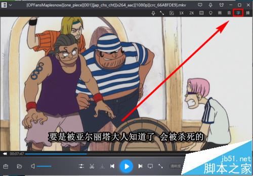 2、現在開始切換字幕,把鼠標移動到暴風影音的標題欄附近,會自動彈出工具欄,點擊工具欄中的【字幕調節】按鈕,圖示如下: