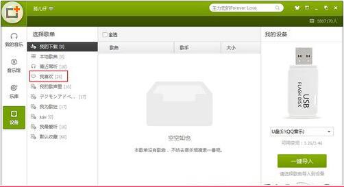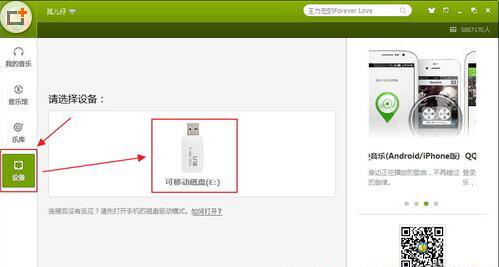 這時候我們需要準備一個U盤或者一臺Android手機,反正可以當U盤存儲的設備都可以。把U盤插上電腦,QQ音樂播放器可以識別到U盤存儲即可。這是我們要在QQ音樂播放器面板中,切換到設備窗口,可以看到QQ音樂播放器已經識別到U盤存儲了。