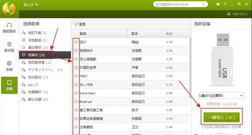 大家根據自己的需求,選擇需要下載的歌曲,當然小編需要全部下載的,勾選全選即可。看到最右邊有個“一鍵導入”按鈕,點擊即可。剩下的就交給QQ音樂播放器完成即可。