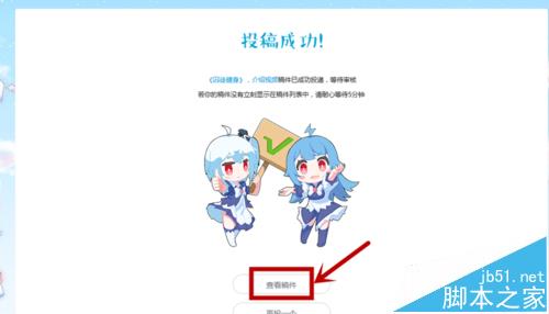 6、稿件提交成功后會有“投稿成功”的提示界面,你可以選擇“查看稿件”選項查看已提交視頻。