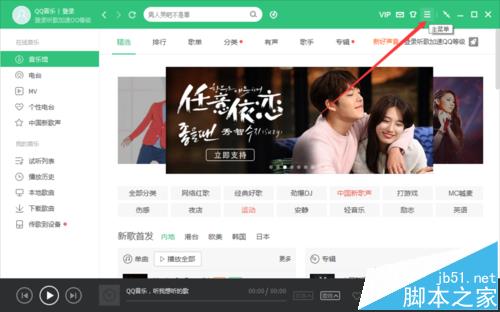 2、在打開的QQ音樂程序窗口,點擊工具欄中的“主菜單”按鈕圖標。如圖所示;