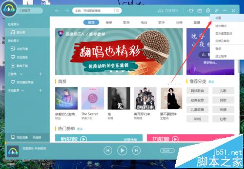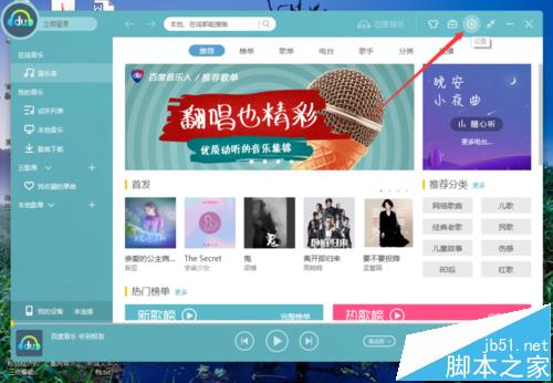 2、在打開的百度音樂程序窗口,點(diǎn)擊工具欄中的“設(shè)置”按鈕圖標(biāo)。如圖所示;