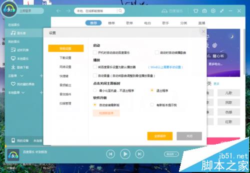 6、在常規(guī)設(shè)置選項(xiàng)右側(cè)窗格中,將啟動下的“開機(jī)時自動啟動百度音樂”選項(xiàng)勾選,再點(diǎn)擊“全部保存”按鈕即可。如圖所示;
