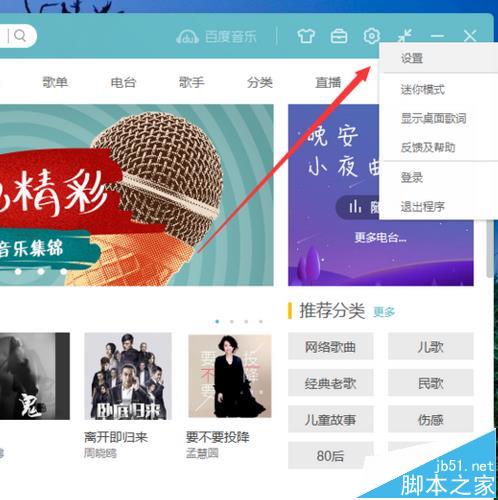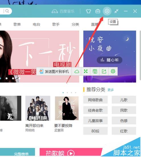 2、在打開(kāi)的百度音樂(lè)程序窗口,點(diǎn)擊工具欄中的“設(shè)置”按鈕圖標(biāo)。如圖所示;