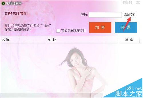 2、進(jìn)入加密窗口后點擊 添加文件 選擇你想保護的視頻文件。