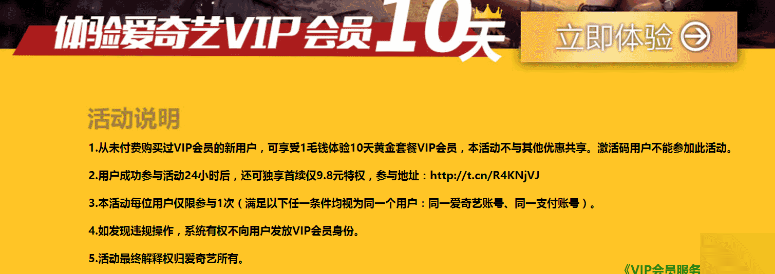 以上就是愛奇藝1毛錢100%得10天黃金套餐VIP會(huì)員介紹,有興趣的朋友快快來參與吧!