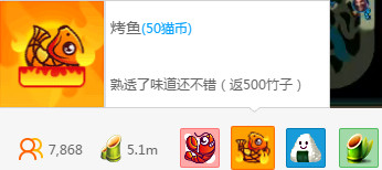 第二個“烤魚”50貓幣一份,這個可比飯團貴了25倍,5塊錢一份。充一次值至少可以買兩份,順帶贈送500竹子。PC6蘋果網小編尋思熊貓吃魚嗎?