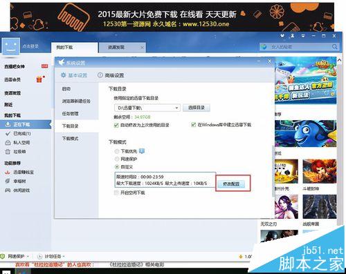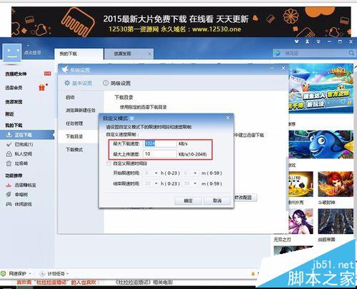 6、設置好相應的上傳及下載速度后,點擊確認,關閉設置窗,完成整個配置,在點擊邊下邊播,基本上是400kb/s,看1.4G以內的視頻不卡頓。下載時長低于電影總共時長就不卡頓。