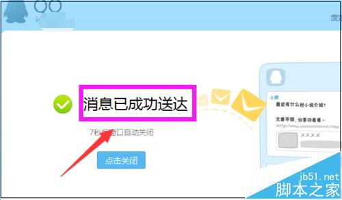8、接下來(lái)就會(huì)看到一個(gè)消息提示窗口,告訴你消息已成功送達(dá),可以點(diǎn)擊關(guān)閉,如不點(diǎn)擊關(guān)閉,幾秒后窗口會(huì)自動(dòng)關(guān)閉。