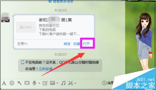 9、當(dāng)你的QQ好友上線,在和你的聊天窗口,就會(huì)看到你分享給她的電視劇,也可以打開你剛剛分享電視劇的QQ群,就可以看到你剛才分享的電視劇,QQ好友或者QQ群友點(diǎn)擊“打開”就可以觀看電視劇嘍!