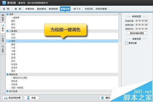 為了讓制作的視頻畫面色調更加漂亮、有特色。我們只需點擊“畫面風格”面板左欄的“美化”,在這里,我們可以輕松對視頻一鍵美顏、美白、磨皮等。還可以為視頻一鍵調色,輕松渲染日系、清新、復古、淡雅、紅潤、浪漫、藍調、阿寶色等色調。你需要的色調在這里都可以一鍵渲染,完全不用像傳統非編軟件那般復雜。