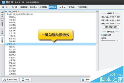 接著,點擊左欄的“動景”,我們只需選中動景特效,點擊“添加風格效果”按鈕,即可為視頻一鍵渲染流行的水墨暈染、繽紛時尚、塵埃星球、金粉之夢、玫瑰人生、花瓣飛舞、秋之物語等頂級動景特效,輕松打造大師級別的視頻效果。
