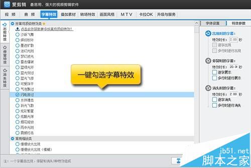 去掉片頭后,我們就可以為視頻添加字幕。在“字幕特效”面板,雙擊右側視頻預覽畫面,即可添加字幕。接著我們在左欄字幕特效欄,一鍵勾選動感的好萊塢字幕特效:墨跡擴散、沙礫飛舞、閃電掠過、炫彩繁星、酷炫光球、震撼打擊、火焰噴射、繽紛秋葉等等。