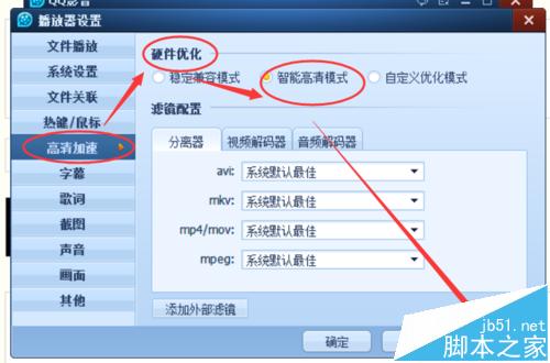 3、在【設置】界面下,點擊選擇【高清加速】--【硬件優化】--【智能高清模式】--【應用】選項完成設置。(如圖所示)