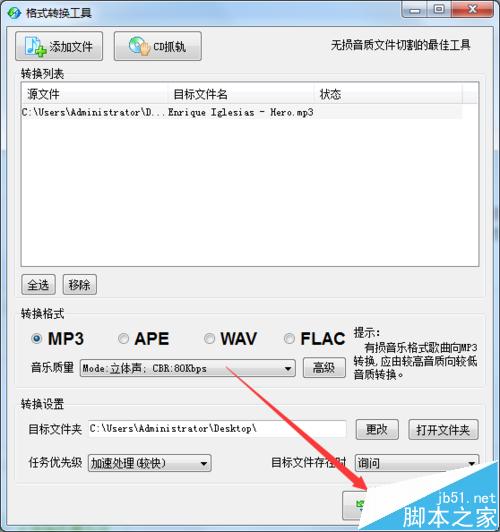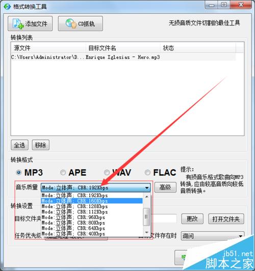 3、只需壓縮歌曲文件大小的話,我們只需點擊如圖所示選項條,然后根據自己的需要選擇文件大小,比如80kbps,一般來說,數字越小,文件越小,當然音質也越差