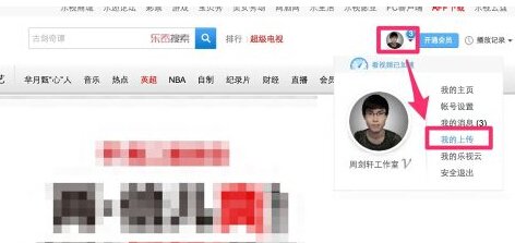 2、找到自己在樂視首頁中的個人頭像,然后點擊一下,從下拉菜單中找到“我的上傳”這一欄并點擊進入下一步。