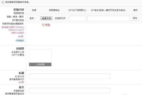 先看投稿內容,紅字部分格外注意(直傳建議碼率1000Kbps,文件大小2G以下,支持mp4格式),填寫分P名字和分P備注后點擊選擇視頻(注意:上傳視頻時,是不能填寫分P名字和分P備注的)選擇視頻及上傳