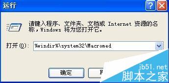 3、單擊“開始”菜單,單擊“運(yùn)行”命令,在打開框中鍵入“%windir%/system32/Macromed”,單擊“確定”按鈕