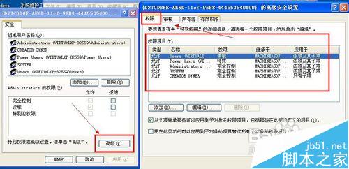 9、單擊“高級(jí)”按鈕,進(jìn)入“高級(jí)安全設(shè)置”對(duì)話框,在“權(quán)限”選項(xiàng)卡下的權(quán)限項(xiàng)目框中刪除掉類型為“拒絕”的項(xiàng)目,然后再去刪除項(xiàng)就不會(huì)出錯(cuò)了