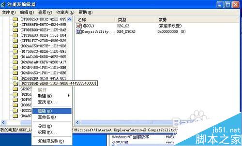 7、在ActiveX Compatibility主項(xiàng)下刪除掉“{D27CDB6E-AE6D-11CF-96B8-444553540000}”和“{D3f97240-C9f4-11CF-BFCr-00A0C90-00A0C90C2BDB}”子項(xiàng)