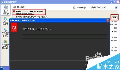 2、在當(dāng)前安裝的程序框中找到并選擇Adobe Flash Player項(xiàng),單擊“刪除”按鈕,接下來(lái)根據(jù)提示說(shuō)明卸載即可