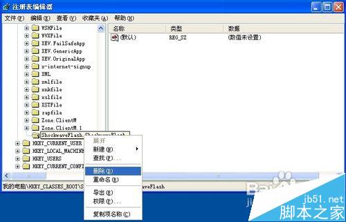 12、再鼠標(biāo)右擊ShockwaveFlash.ShockwaveFlash項(xiàng),打開的右鍵菜單單擊“刪除”命令