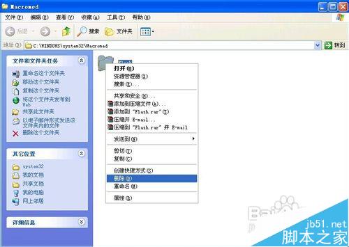 4、在打開的目錄窗口鼠標(biāo)右鍵刪除“Flash”文件夾