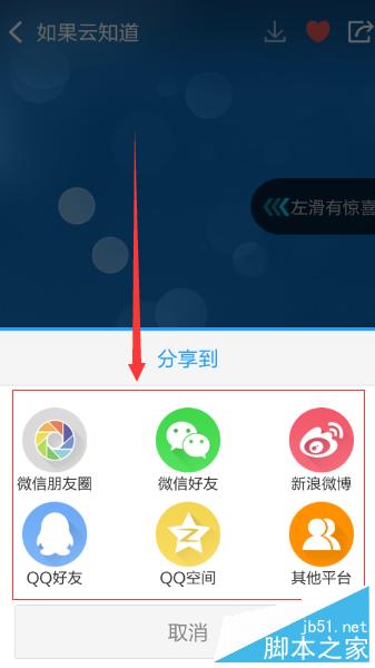 5、接著我們點(diǎn)擊分享按鈕后,會(huì)出現(xiàn)一些我們可以分享歌曲的平臺(tái),有微信,微博等等很多平臺(tái),我們選擇自己想分享的某個(gè)平臺(tái)。