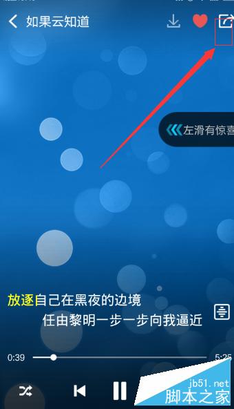 4、選定歌曲之后,我們?cè)谙旅娴牟シ诺母枨厦纥c(diǎn)擊下,出現(xiàn)歌曲歌詞的界面,并且我們看到在歌曲播放的詳細(xì)信息界面的右上角有一個(gè)分享按鈕。