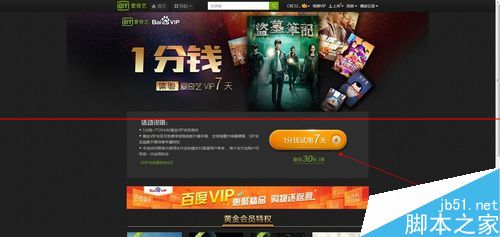 9、瀏覽打開http://vip.iqiyi.com/7daystrial1cent.html?fc=81d8deee641366f9&src=focustat_1_20130410_1活動(dòng)鏈接入口。點(diǎn)擊“一分錢試用7天”。
