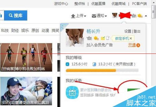 2、登陸成功后,移動鼠標到我的頭像那邊,會彈出一個下拉框,我們在下拉框中可以看到有個簽到的功能,點擊簽到