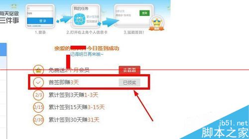 3、進入到簽到頁面我們可以看到提示我們今天已經成功簽到了,首簽即賺3天,累計簽到3天賺1-3天,累計簽到15天賺3-15天,累計簽到30天賺31天