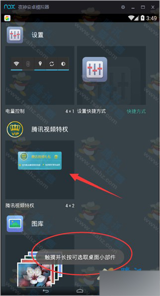 4、打開桌面小部件后向下拉即可看到“騰訊視頻特權”,長按插件拉到桌面便可。