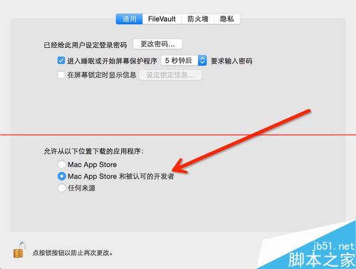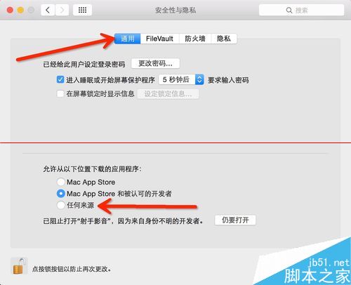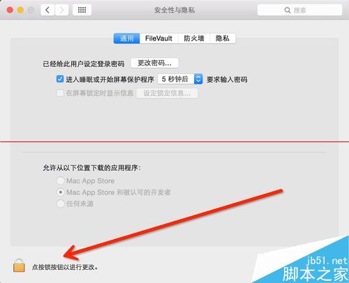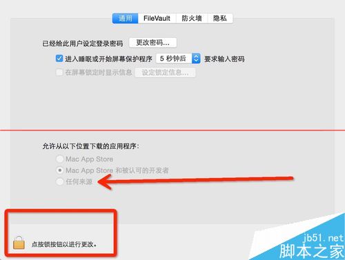 4、點擊通用,這里“允許安裝任何來源”是灰色,無法選擇,點擊左下角的鎖