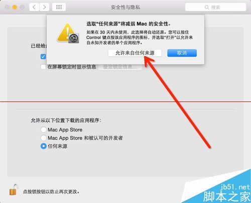 6、現在就可以選擇Mac安裝使用任何來源的軟件了,點擊“任何來源”