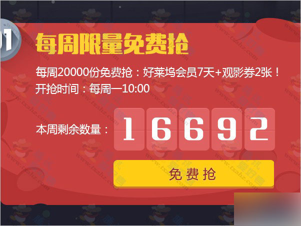 1. 活動每周提供20000份“好萊塢會員7天體驗資格”,QQ會員/超級會員可于每周一上午十點開始領取,數(shù)量有限,先到先得。