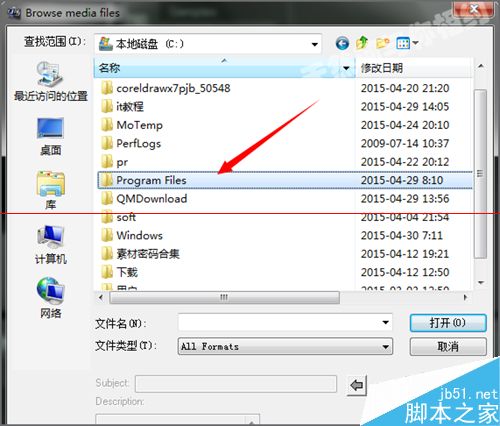 3、這時候它就會彈出一個對話框,我們找到會聲會影安裝位置。如果您在安裝的時候是沒有更改它的路徑的話,是默認在c盤的。這時候我們點擊打開c盤。在面板的列表中找到Program Files的文件夾。
