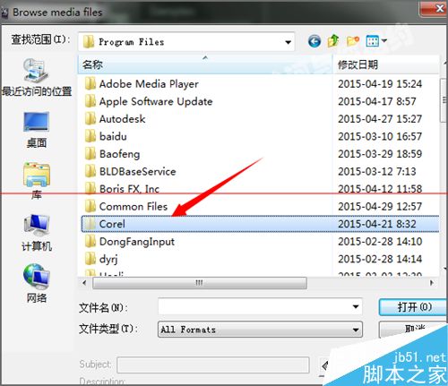 4、雙擊打開Program Files的文件夾后,在打開的面板中選擇Corel的文件夾。如果在你的電腦上安裝了多個版本的corel軟件的話,它都會默認的安裝到這個文件夾中。