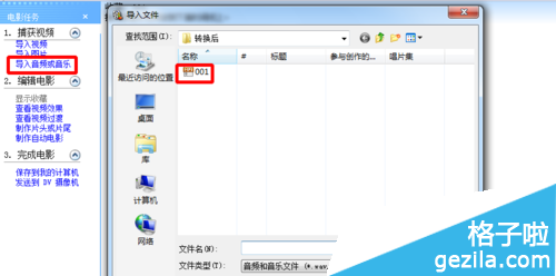 10、再把放大后的音頻導入。單擊導入音頻或音樂,找到文件,單擊導入。