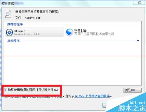 6、恭喜你,這樣就安裝成功了,然后找一個csf文件,點擊右鍵,打開方式--選擇默認程序,然后選中”景橋播放器“,并且勾選”始終使用選擇的程序打開這種文件“