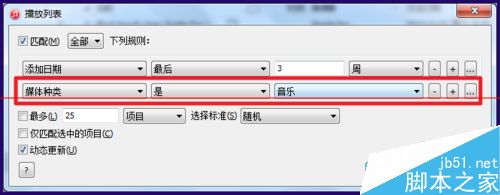 10、點(diǎn)擊第一個(gè)規(guī)則后面的【+】,就可以再添加一個(gè)規(guī)則,設(shè)置如下,選擇【媒體種類】為【音樂】,這樣只有音樂才能顯示在這個(gè)播放列表內(nèi)了