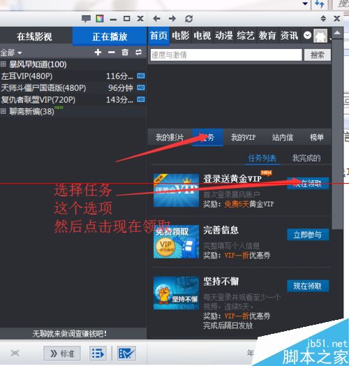 5、點(diǎn)擊后,在下面的那個(gè)窗口中會(huì)出現(xiàn)“任務(wù)”這個(gè)菜單欄目,點(diǎn)擊一下。會(huì)看到第一個(gè)活動(dòng)“登陸送黃金VIP”,馬上點(diǎn)擊“現(xiàn)在領(lǐng)取”。