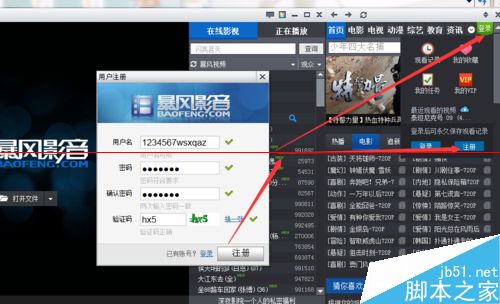 2、先打開(kāi)暴風(fēng)影音,在彈窗右上角“登陸”出點(diǎn)擊一下,然后點(diǎn)擊“注冊(cè)”,在注冊(cè)窗口中完善注冊(cè)信息,完成后點(diǎn)擊“注冊(cè)”。