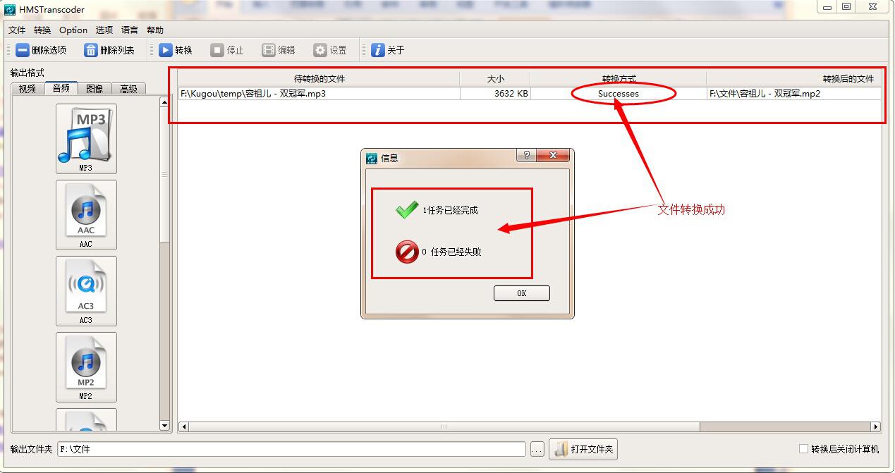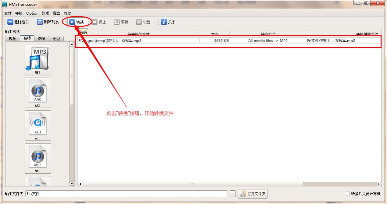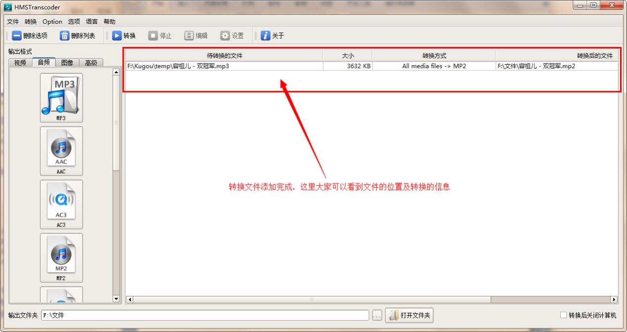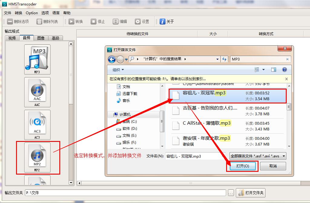 3、這里我們以MP3文件為例,將其轉換成MP2格式。點擊軟件左側音頻列表下的“MP2”按鈕,在打開的窗口中找到需要轉換的MP3文件,選定,然后點擊“打開”按鈕,轉換文件添加完成。