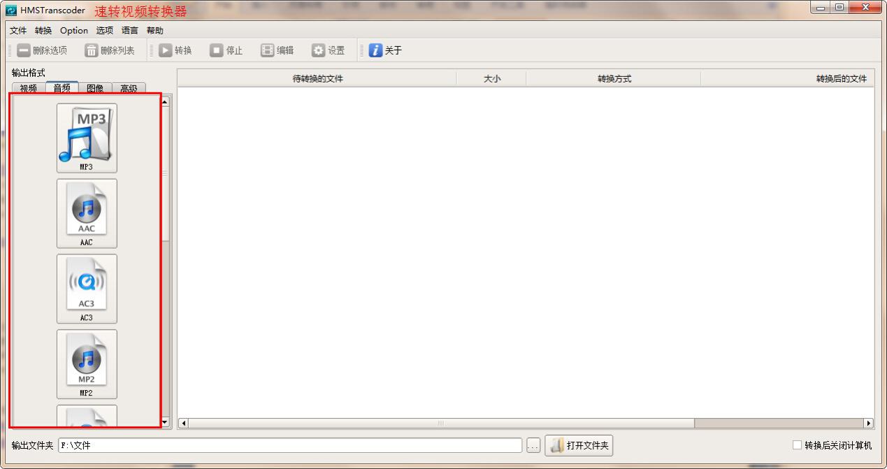 在音頻轉換方面,速轉視頻轉換器可以高速地將各種主流音視頻格式,如MP3、WMA、MP2、等格式,編輯轉換輸出AC3、MP2、WMA、AMR、OGG、FLAC等音頻格式。