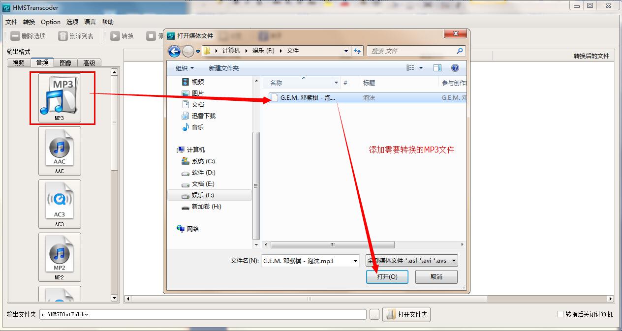 步驟2:點(diǎn)擊輸出格式中的“音頻”按鈕,再在顯示的輸出格式中選擇需要的格式,點(diǎn)擊后會(huì)出來(lái)一個(gè)窗口,在打開(kāi)的窗口中找到需要轉(zhuǎn)換的文件,并將其添加到軟件中。