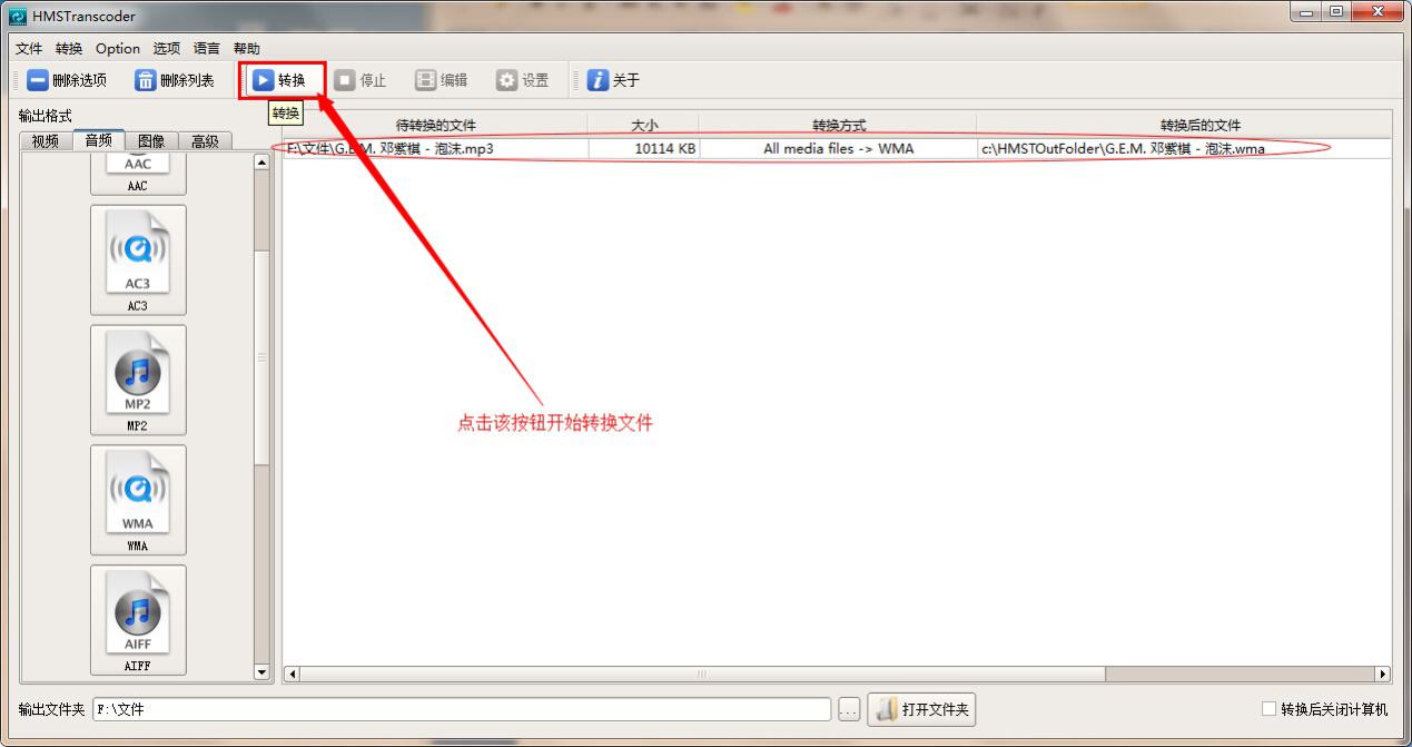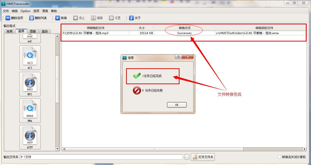 步驟5:幾秒鐘之后,MP3文件就順利轉(zhuǎn)換成了WMA文件,大家可以看到相應(yīng)的轉(zhuǎn)換成功提示。這時(shí)你就可以對(duì)轉(zhuǎn)換成功后的WMA文件進(jìn)行欣賞了。